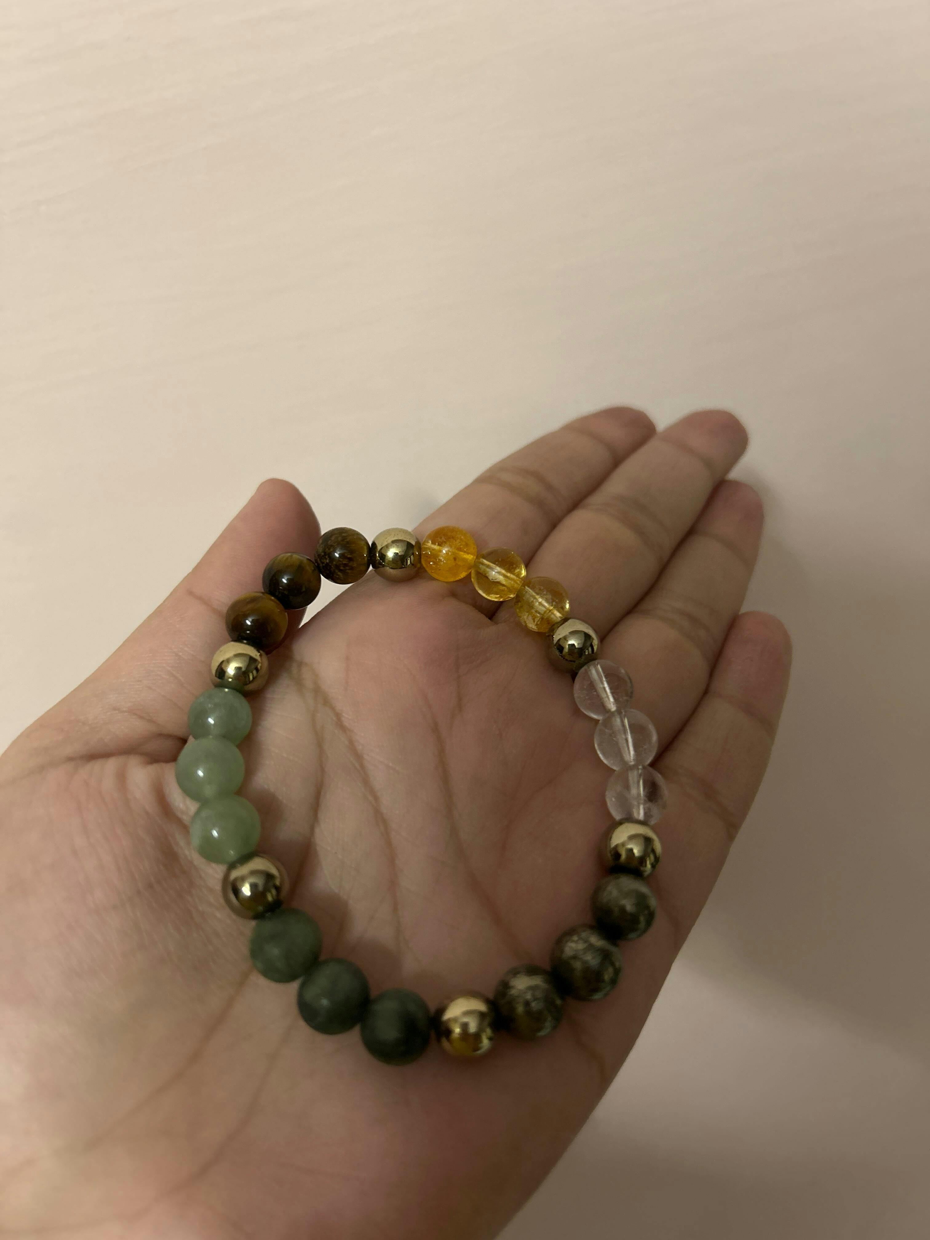 Carefully handcrafted with Green Aventurine, Citrine, Tiger’s Eye, Clear Quartz, Raw Pyrite, Green Jade, and Golden Pyrite separators, this bracelet brings together powerful symbolic energies: